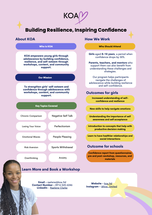 KOA empowers girls (8-14 years) through engaging workshops designed to boost confidence, resilience, and self-esteem.